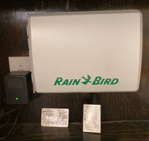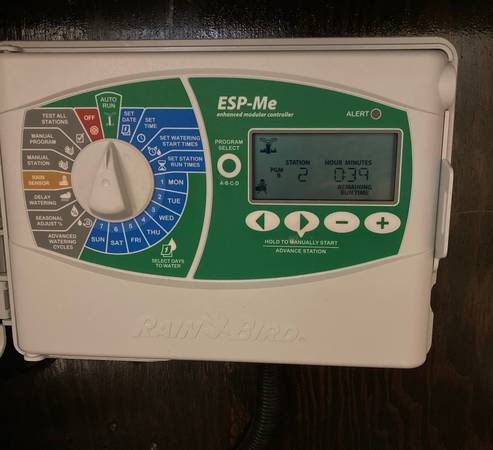 Rain Bird ESP-Me irrigation controller in perfect condition, perfectly functional, zero damage or defects. One of the photos shows it in a watering mode. (It is a 4-station unit with a 3-station expansion module totaling 7 stations)