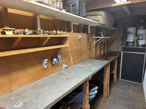 Shed has 20 years warranty Shingles roof, has a work bench 15 feet long, shelves, and power plugs and 3 ceiling light with fluorescent neon bulbs, everything work and are currently hooked up to external power.