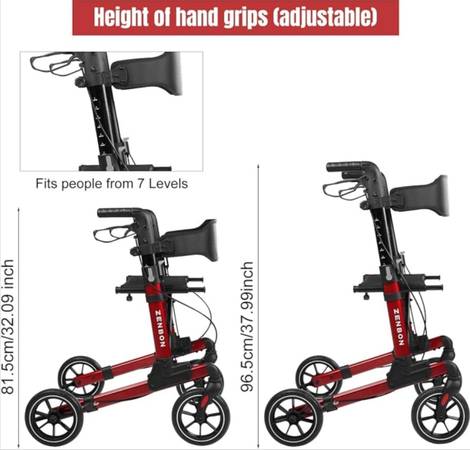 Rollator Walker features an ergonomic handle that provides a secure grip and adjusts from 32.09 to 37.99 inches, promoting proper posture.