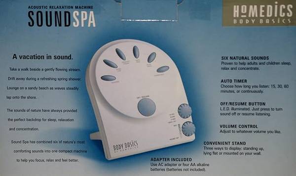 Brand New: Body Basics by Homeric's: 6 Natural "Sound Spa" Acoustic Relaxation Therapy Machine Or Sleep Aid. This is perfect for adults and infants. This acoustic relaxation machine that runs on normal AC electric or batteries. Has stand to use on end table or hung on wall.