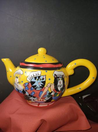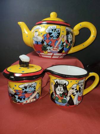 This is a great set for cat lovers featuring bight colors and wonderful cat figures. This set includes; tea pot (11" wide x 6" inches wide), creamer bowl (6 inches wide x 4-inches tall,), sugar bowl (4-inches wide x 3,5-inches deep.