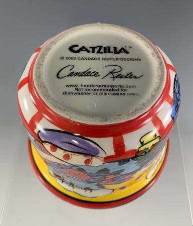 Rare Set: Catzilla By Candance Reiter 3-Piece Tea Set Ceramic Tea Pot With Lid, Creamer Bowl, Sugar Bowl With Lid. The Artist "Candance Reiter" And Date "2003" Are Stamped On The Bottom Of Each Item.