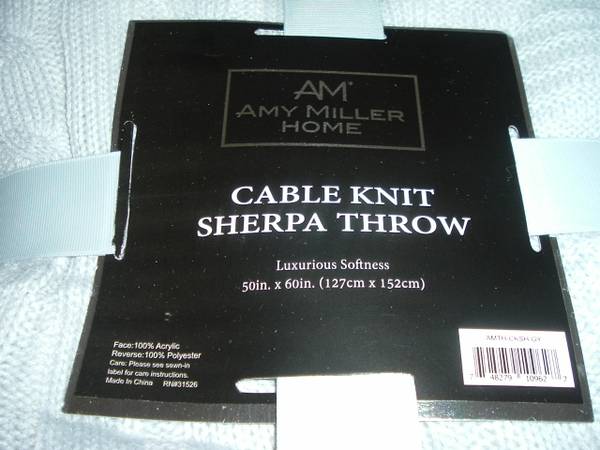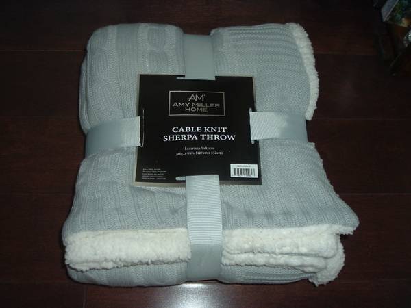 Brand new in original packaging. This soft and luxurious reversible throw blanket is gray cable knit, white sherpa style, measures 50 inches wide and 60 inches long, 100% acrylic face, reverse is 100% polyester