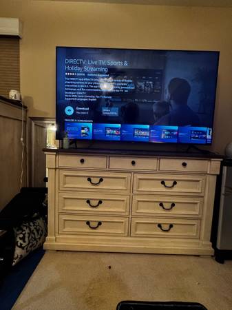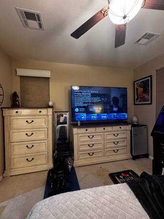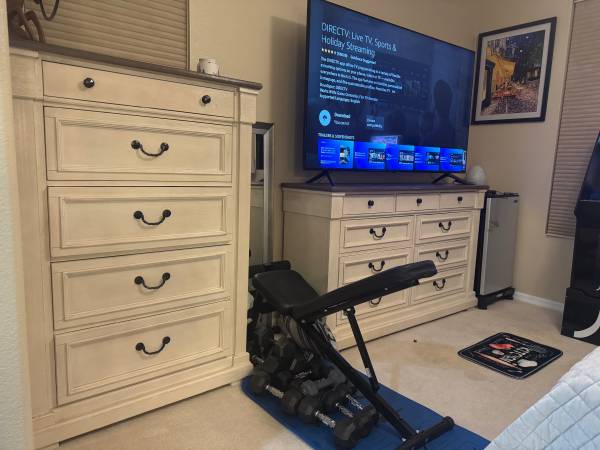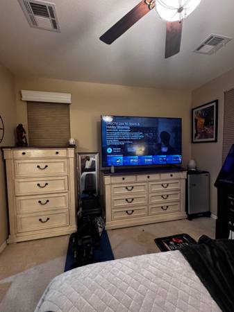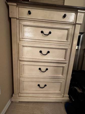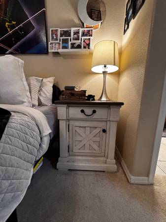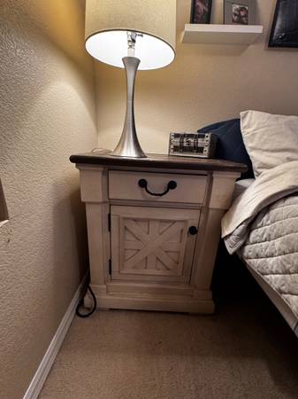 Ashley furniture bedroom set two night stands two lamps 9 drawer vanity dresser with largr mirror , chest of drawers asking $10000with Cal king bed $600 without c I paid over $4k