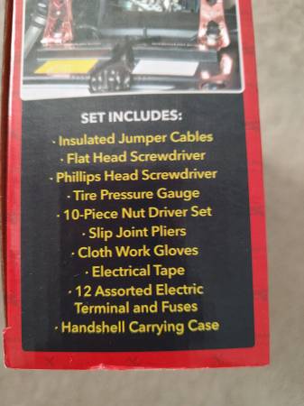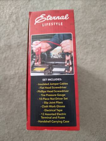Brand new, never been opened, in original box packaging. This handy auto safety accessory kit features insulated battery jumper cables, tire pressure gauge, flat head and Phillips head screwdrivers, 10 piece nut driver set, slip joint pliers, cloth work gloves, 12 assorted electric terminal and fuses, electrical tape, all in a convenient hardshell carrying case