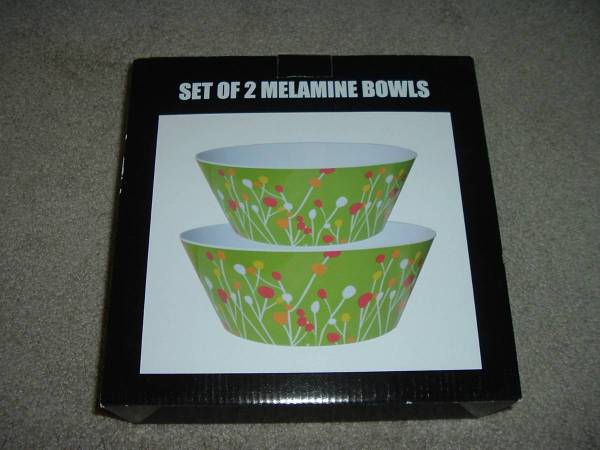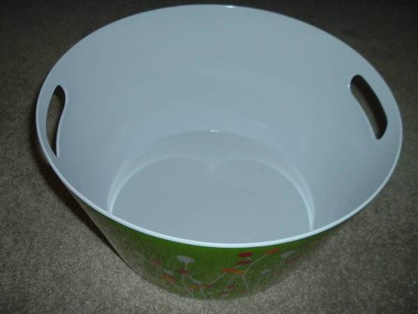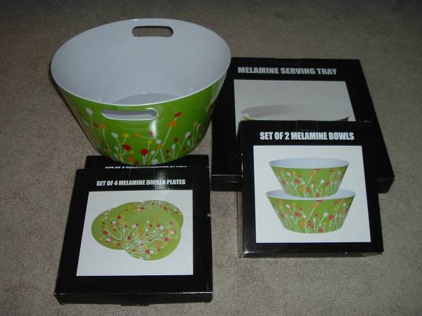 Brand new in original packaging. This matching set of melamine dinnerware comes in a summery green with floral pattern. Buy them separately, or get the whole set at a discount! Great for everyday indoor/outdoor use, picnics, parties, barbeques. Bucket could double as a colorful toy bin, laundry basket, odds and ends storage container. Break and chip resistant. Dishwasher safe, top shelf only. Not intended for microwave or oven use.