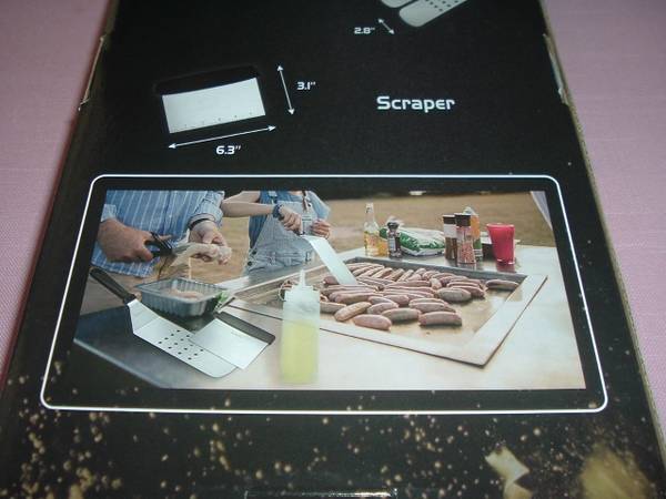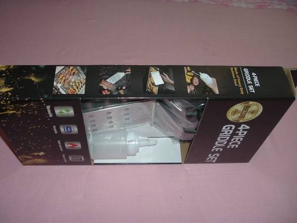 Brand new, never been used, comes in original unopened packaging. This 4 piece barbeque Griddle Set includes a condiment squeeze bottle, grill scraper and 2 oversized grill spatulas made of heavy duty stainless steel. Heat resistant, reusable, easy to clean and portable