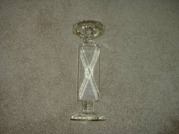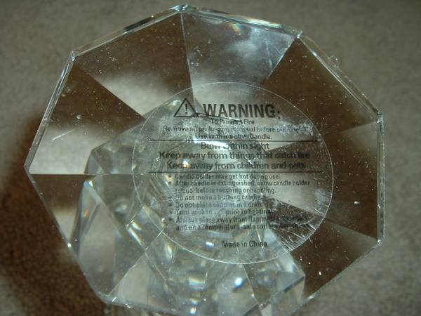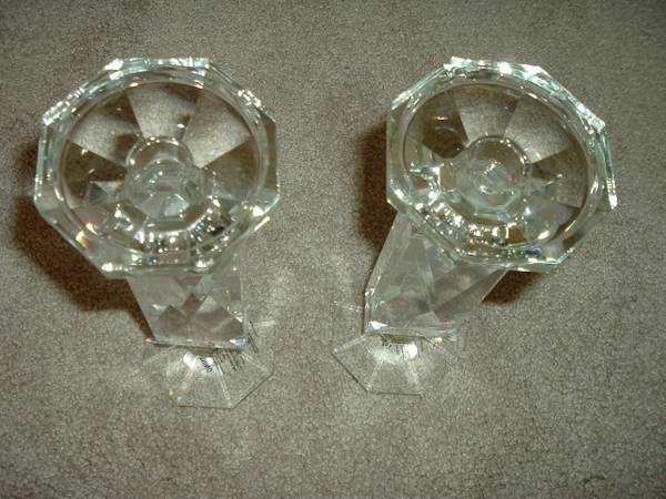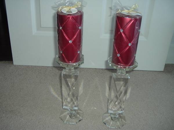 Brand new, never been used. These solid, quality pillar and taper candleholders measure about 10 inches tall and 3 1/2" diameter, feature a beautiful cut glass design and are heavy and strong