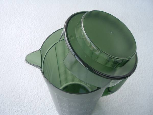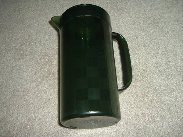 Brand new, never been used in original sturdy white box packaging. This green, break resistant plastic pitcher features a snug fitting, slotted lid to help prevent spilling and facilitate easy pouring, measures about 9 inches high and 4 3/4" in diameter. 4 matching glasses feature a ribbed design, measure about 4" high and 3" in diameter. Glasses fit into pitcher for convenient, shelf saving storage
