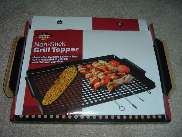 Brand new, never been used in original packaging. Be ready for barbeque season with this non-stick, black grill topper, features 12" x 16" perforated grilling surface, raised edges to help keep food from slipping off, and convenient hand holds, hand wash