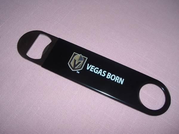 Brand new, never been used in original packaging, opened only to take photos. This sturdy, stainless steel flat speed bar bottle opener features the Vegas Golden Knights logo and reads "VEGAS BORN" on the front, with a Smart Water reminder on the back, measures about 7 inches long and 1 11/16 inches wide