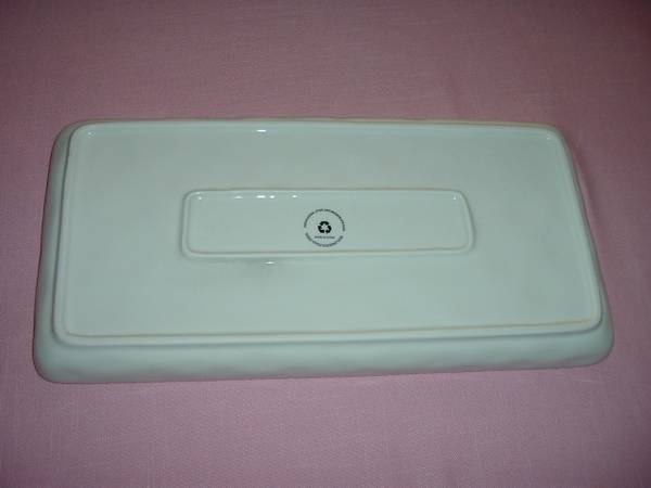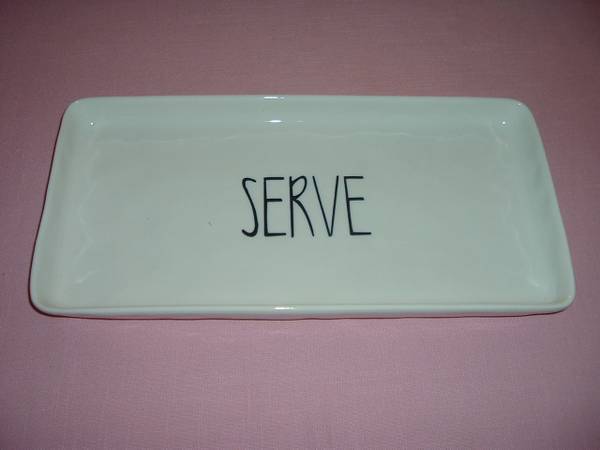 Brand new, never been used in original sturdy white gift box packaging. This white ceramic serving platter measures about 14" long, 7" wide and 1" deep. Has SERVE in black block lettering on a dimpled surface pattern. Dishwasher, Oven and Microwave Safe, eco-friendly