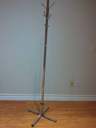 Safco metal coat rack for home/office. 4 double hooks with ball tips to avoid coat damage. Wide 21 inches base to keep coat rack still