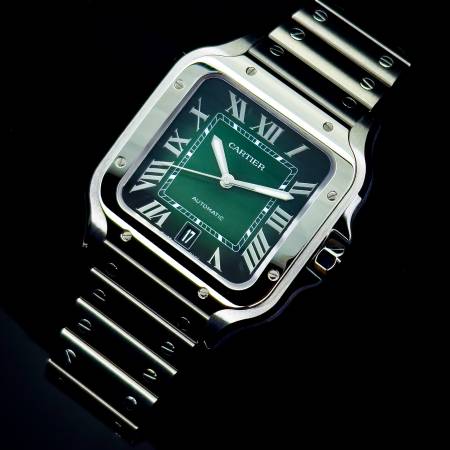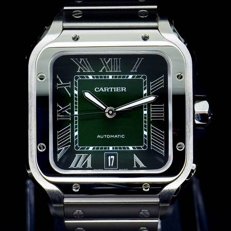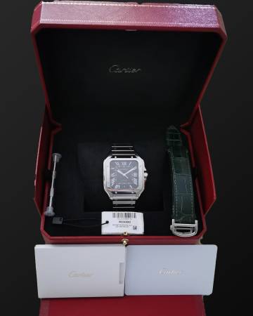 The Cartier Santos de Cartier features a 39.8mm stainless steel case, graduated green dial, and steel bracelet with SmartLink adjustment. Powered by the automatic Caliber 1847 MC, it offers a date display, luminescent sword-shaped hands, and 100m water resistance. Includes QuickSwitch system and an additional green alligator strap.