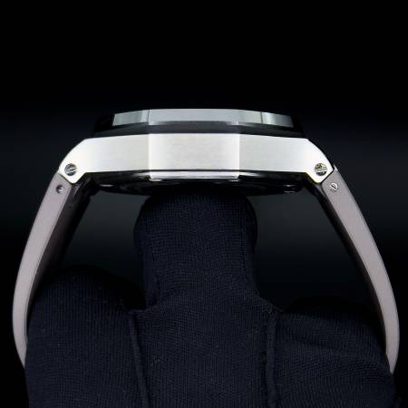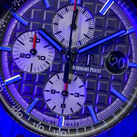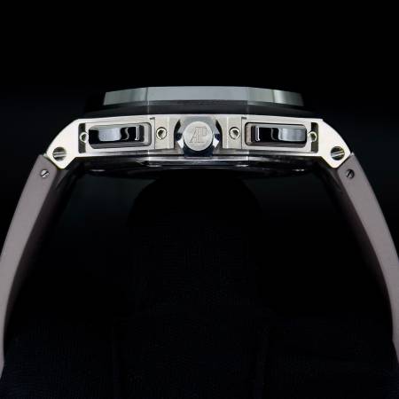 Crafted from lightweight titanium and accented by a sleek black ceramic bezel, this 44mm Royal Oak Offshore Chronograph offers a monochromatic aesthetic with a sporty edge.
