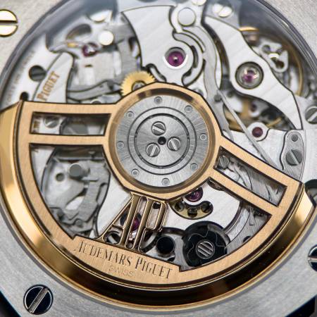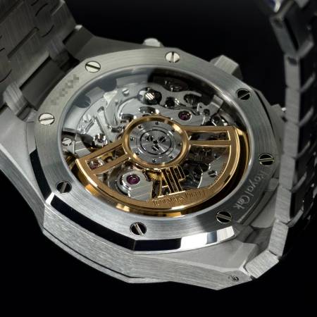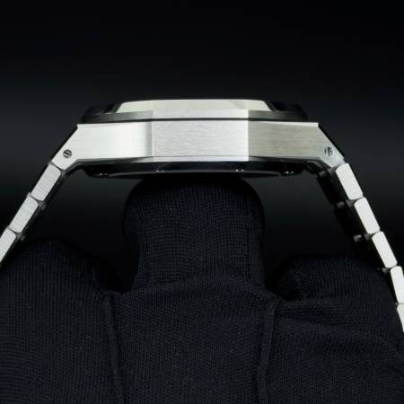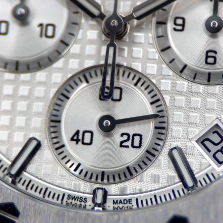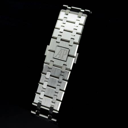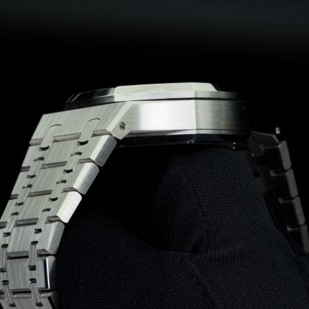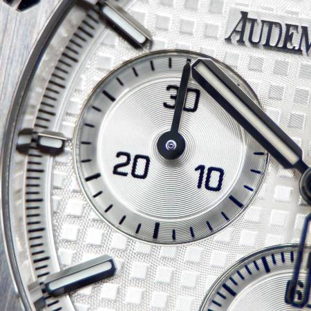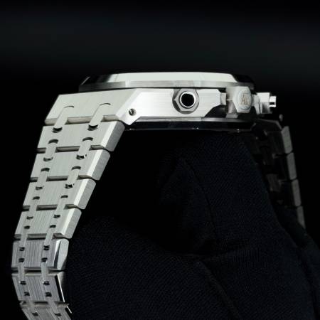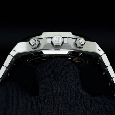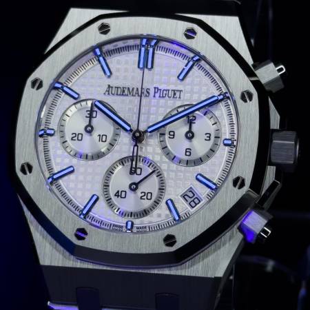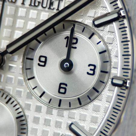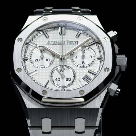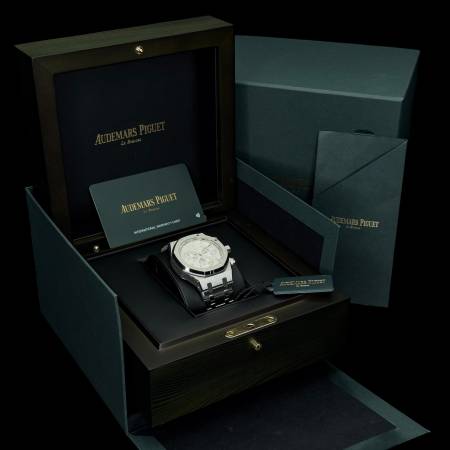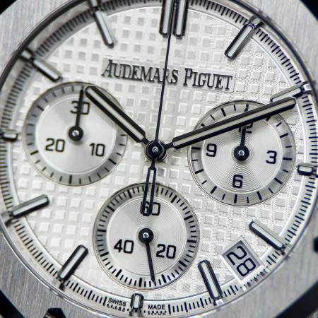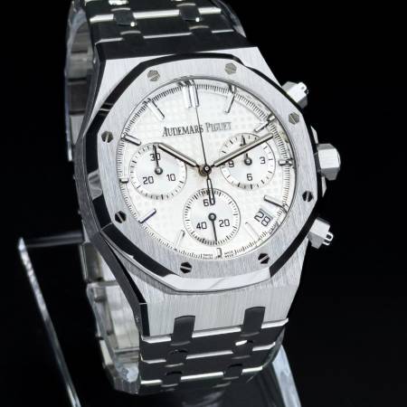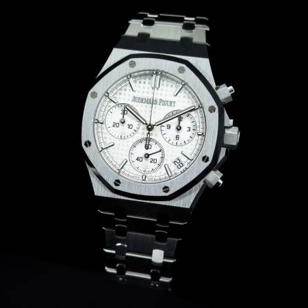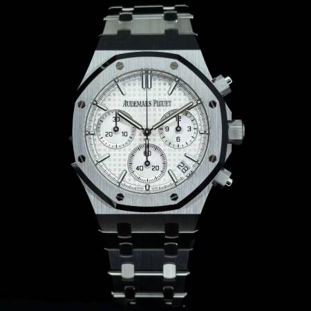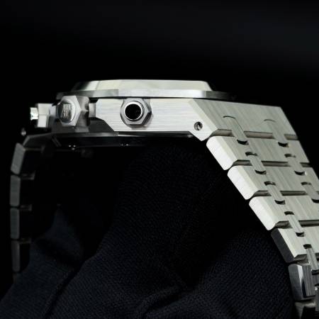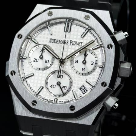 Celebrate the 50th anniversary of the Royal Oak with a timeless white/silver dial and upgraded mechanics. It features a stainless steel case, silver “Grande Tapisserie” dial and integrated bracelet. Powered by the in-house Caliber 4401, it offers flyback chronograph functionality, 70-hour power reserve and a sapphire caseback. A refined evolution of AP’s iconic sports chronograph.