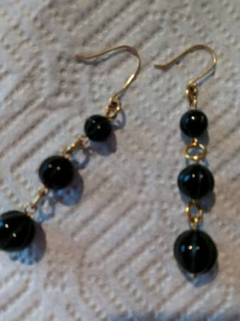 14kt gold over sterling silver. 3" long. The onyx balls have cuts in them like a cantaloupe. I am allergic to metal, and can only wear 14kt gold, and higher, and/or sterling silver. By wearing the earrings, I knew they were real, because I had no reaction. I have sanitized them 4 times. Originally purchased from a long time eBayer. Check out the link for other items I have for sale. Please leave a message if I am not available. No e-mails please. Texting is okay.