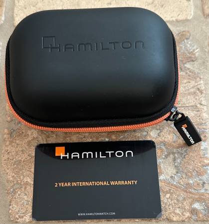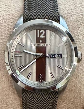 Men's watch in excellent condition. 40mm stainless steel Swiss Made watch by the Hamilton Watch Company. It is their Broadway model. It has a silver dial with brown accenting, a quartz movement, and a date display at the three o'clock position. The watch has its original cloth and leather strap, and the Hamilton logo on the silver buckle. The original travel box and warranty card are included.