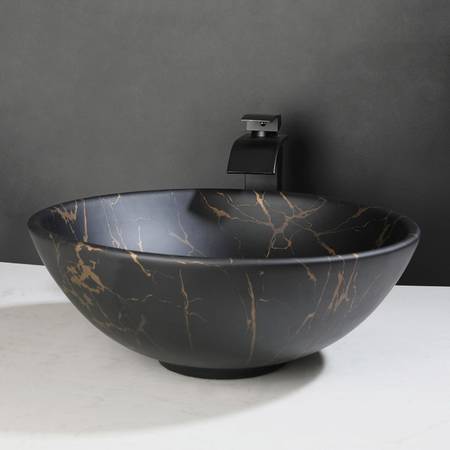 Bathroom Vessel Sink Black Ceramic Vessel Sink with Waterfall Faucet and Pop-Up Drain Combo, Above Counter Round Bathroom Sink Bowl