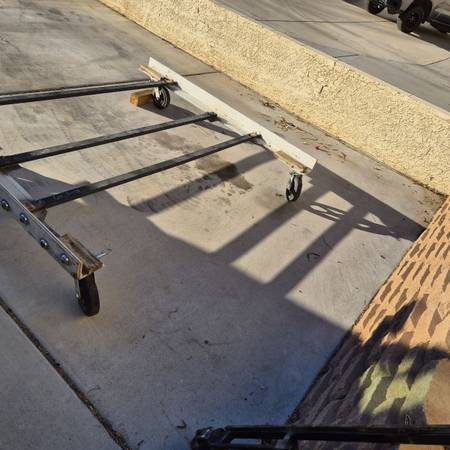 Extra large heavy duty rolling base/cart. This was used for an exhibit piece that we no longer have. Wheels can lock in different directions. We have an 800 plus pound piece on this dolly and it maneuvered well. Dimensions are 78"x68"x13" high at top edge. Very well made..email if interested