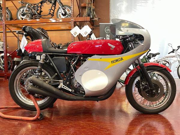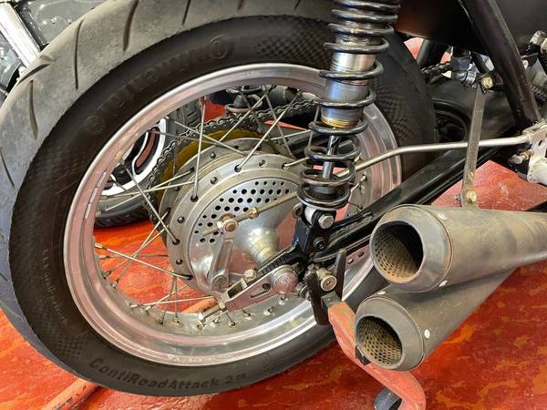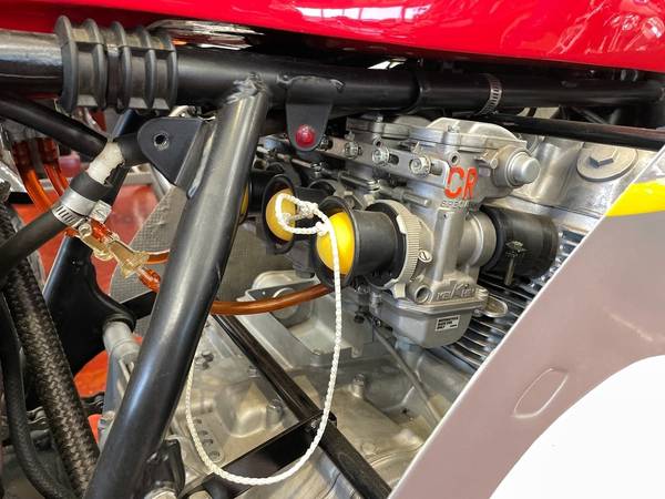 The Honda CR750 ‘Dick Mann’ Tribute offered here has been owned by a SoCal enthusiast for about the last several years. The build started with a refurbished CB750F frame with a 1971 SOHC inline-four, increased in displacement to 761cc during rebuild in 2020. Modifications include Keihin CR carburetors, a CR-style fuel tank, Norris race camshaft, an alloy CR oil tank, heavy duty primary chains and cam chain, upgraded bearings and shaft, Dyna electronic ignition, a Lytron oil cooler, dual progressive adjustable Öhlins rear shocks, a Swarbrick four-into-four exhaust, and a CR-style seat unit and fairing mounts/hardware from Mead Speed in the UK. 18″ Akront front and Morad rear wheels wear Continental Road Attack CR 2 tires that measure 110/80 and 130/80 respectively. Steering is handled with clip-on handlebars and a steering damper, and front suspension consists of 1978 CB750 F2 forks w/new seals. Braking is from dual front discs with Nissin calipers, and a polished vented rear drum. Further modifications include performance clutch plates, heavy duty clutch springs, and a RK 530H heavy duty drive chain connecting the 13T primary drive sprocket to the 48T rear sprocket. The bike is kick-start or rear roller-start only, and the clutch action is firm but not oppressively so.