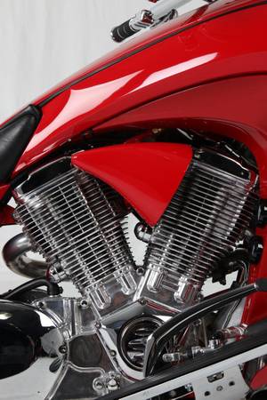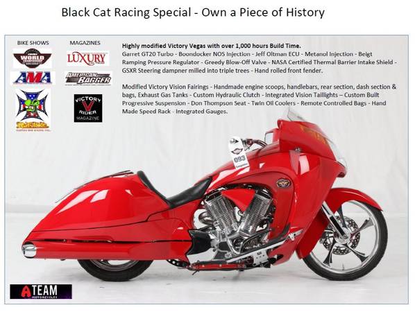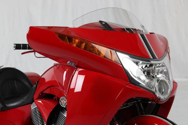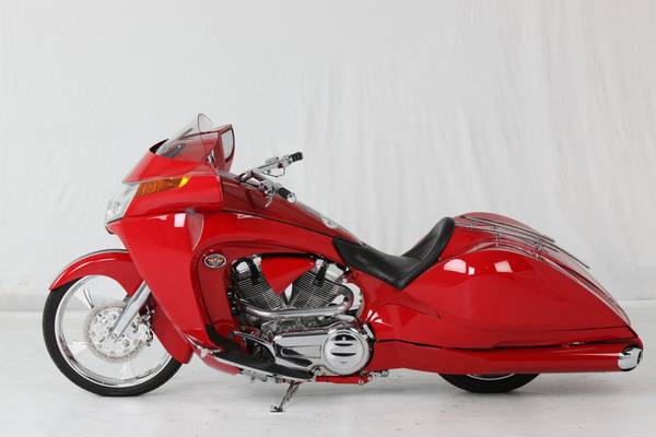 Modified Victory Vision Fairings - Handmade engine scoops, handlebars, rear section, dash section & bags, Exhaust Gas Tanks - Custom Hydraulic Clutch - Integrated Vision Taillights – Custom Built Progressive Suspension - Don Thompson Seat - Twin Oil Coolers - Remote Controlled Bags - Hand Made Speed Rack - Integrated Gauges.