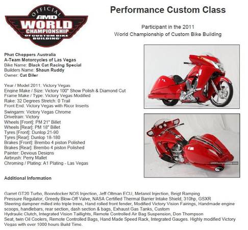 Highly modified Victory with over 1,000 hours Build Time. This beautiful motorcycle has been totally transformed with a complete rebuild by International multi award winning custom motorcycle builder Shaun Ruddy.