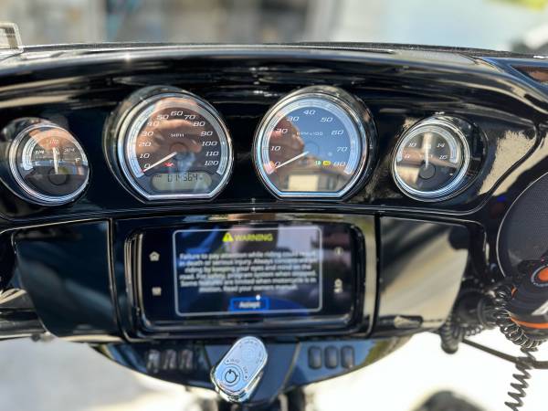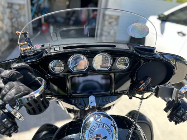 Upgrades? This thing is practically its own accessory catalog. HD Willy G-Skull gas cover, highway pegs, passenger foot rests, rearview mirrors, upgraded shifter lever, Stage 1 Screamin’ Eagle package, and Rinehart Racing pipes that announce your arrival a solid three zip codes ahead of schedule. Ciro LED white front/turn signal lights, Arlen Ness grips, Harley-Davidson Halomaker headlights bright enough to make midnight jealous… and the latest Boom! Box GTS Radio Kit upgrade—a $2,000 piece of infotainment wizardry that keeps the ride loud, clear, and wired for the long haul.