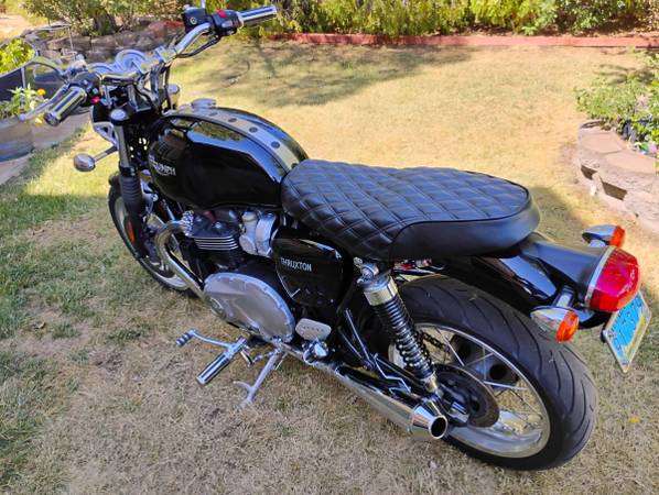 2016 TRIUMPH THRUXTON 1200cc. Forward controls, custom raised bars for comfort (75 year old owner). Have extra custom diamond stich seat for riding double. 6000 miles. Bike has been pampered and meticulously maintained with full synthetic fluids. Catalytic converter removed with tuned bypass. Have all original parts as well. Super fun bike to ride, lightweight, fast (100hp), and handles like dream! Classic British style with modern performance and reliability! $8000