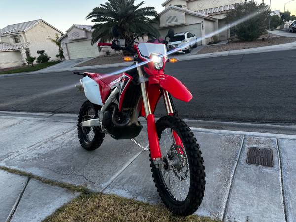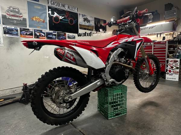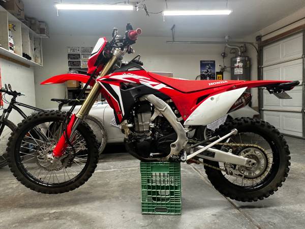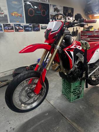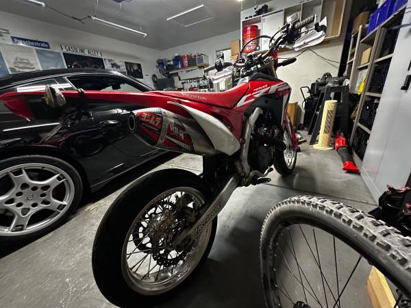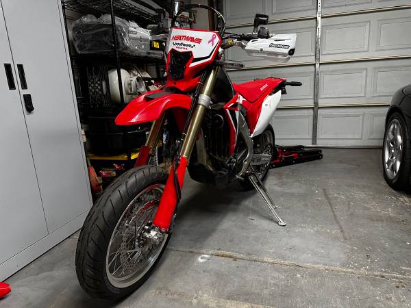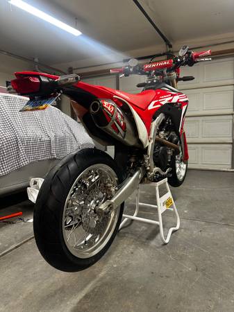 Comes with the Alpinestars jacket, size L, with liner and back pad. Also comes with a work stand (white one in the pics), folding ramp, lowering link, extra tubes, and a 4 gallon gas tank that I never put on. Additionally, it has all the dirt setup takeoffs. The supermoto and dirt rear wheels have the same size sprocket so you don't have to switch chains when swapping rears. I can give you a Fox helmet in size L if you want as well.