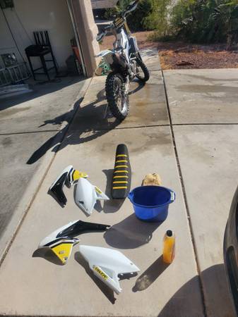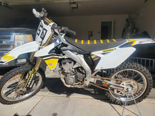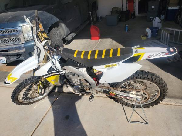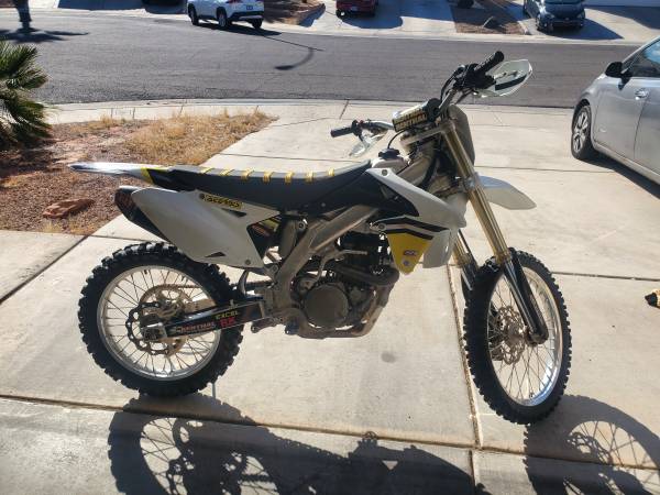 2012 Suzuki RMZ 450. Brand new fuel pump, air filter, and spark plug. Valves were done about 20 hours ago. Renthal bars, Excel rims, full Yoshimura exhaust, fat foot pegs, white Acerbis plastics and hand guards. Comes with original yellow plastics, bike ramp, 2 tie downs, gas can, extra hardware, chain lube, air filter oil, engine oil, and oil filters. Great bike, plenty of power and very comfortable, just don't have time to ride anymore.