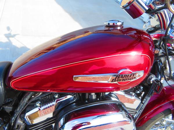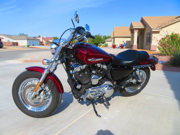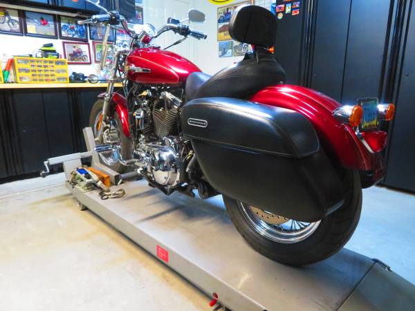 I bought this new and ordered it from the factory with: Chrome Engine, Pull Back Handlebars, Mid Controls, Velocity Red / Sunglo Paint, Chrome 16" Spoke Wheels Front and Rear, Quick-Release Windshield, Rigid Leather Locking Saddlebags, Turn Signal Relocator Kits, Signature Series Solo Seat W/ Backrest as well as standard seat, Also installed adjustable forward highway bars, K&N Air Filter, Progressive Shocks on Rear and Progressive Monotube Fork Kit. I replaced the motor @ 30K and installed one from a 2014 Sportster with 13K on it which I purchased from a salvage dealer in Florida and have all the paperwork. The original engine developed a knocking sound which I found to be the Big End Bearing on the front cylinder connecting rod even though I had maintained the bike to higher standards than the manufacturer called for, very disappointing. Rather than go thru a costly bottom end rebuild I replaced the whole engine. I've since put 6K trouble free miles on it. The Bags, seat and, windshield are easily removed for that Bobber Look or, installed for cruising. All are included with the bike. New front tire @ 33,186 Michelin Commander II, New rear tire @ 32, 737 Michelin Commander II both front and rear tires have lots of tread left. Just changed engine oil and filter as well as primary oil.