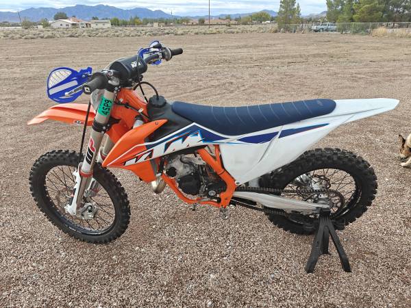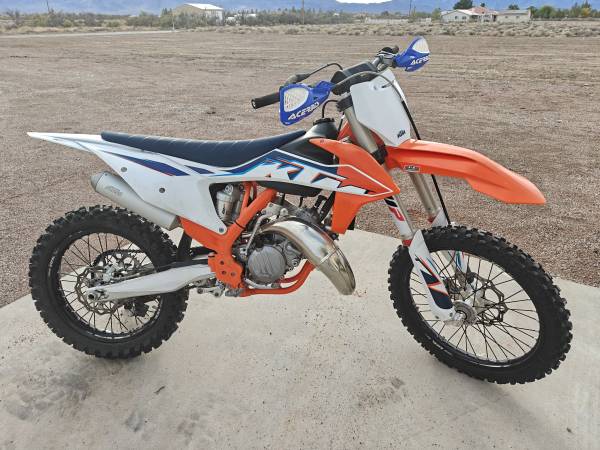 2022 KTM 150SX. 21.3 hours. Track ridden not raced by a Senior +50 rider. Never crashed. Very fun bike. Last year of the 150SX with a carburetor. Engine is stock with added Keihin and V Force reeds for better throttle response. Has Acerbis Flag hand guards, extra Sprockets and chain, includes new rear Dunlop tire MX53. I own this bike outright and have the title in hand.