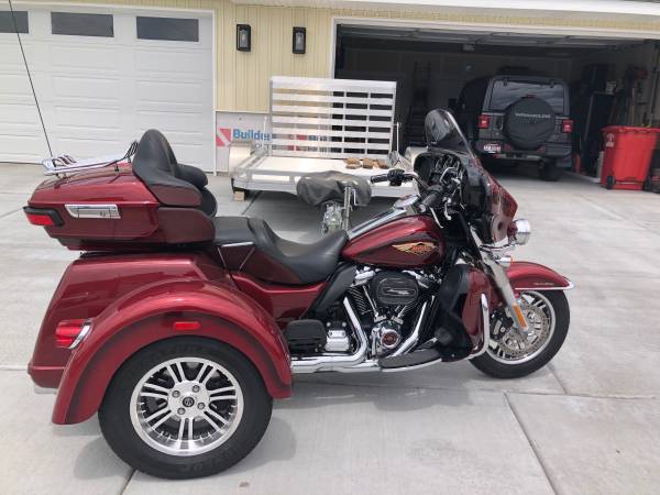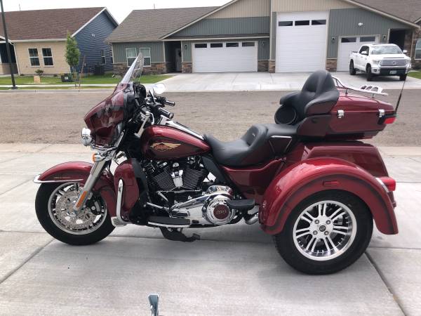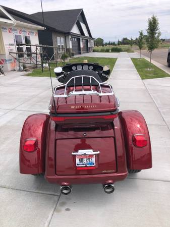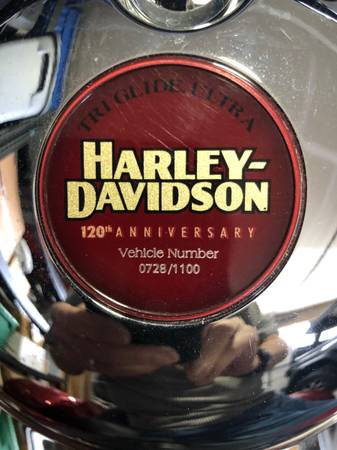This is a 2023 120 year Anniversary FLHTCUTGANV Tri Glide Ultra, Vehicle Number 0728/1100. It has the Twin-Cooled Milwaukee-Eight 114 cid engine. Engine is rated at 93 HP at 5020 rpm and 120 ft-lb tq. The trike has the latest ABS system - Traction Control - Cruse Control - Boom Box - Tour pack with luggage rack - electric reverse - and much more. Also a pair of Cardo Freecom 2X helmet to helmet com units, two helmets and a lot of extra gear. This will all be sold as one package. You have to see the trike to take it all in.