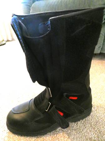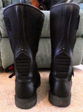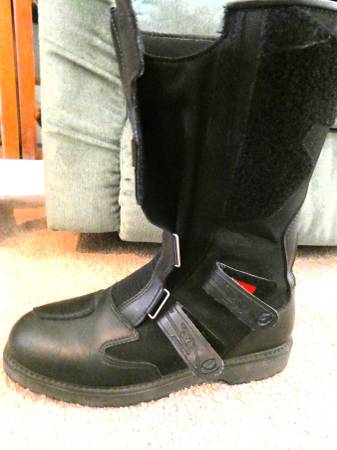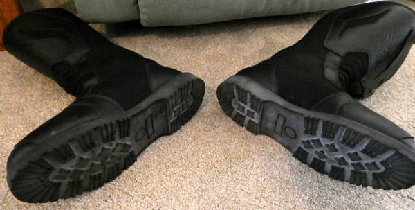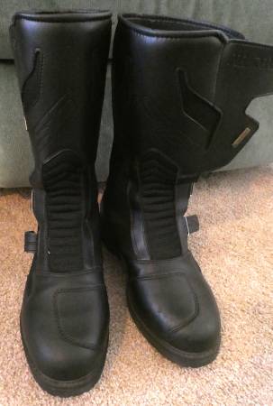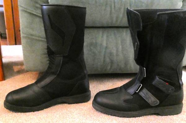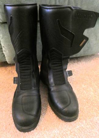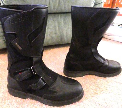 Gore-Tex, heavy duty but really comfortable motorcycle boots. [If they fit, they are comfortable both on the bike and off.]