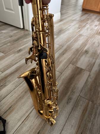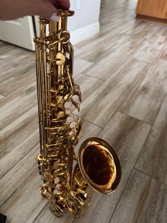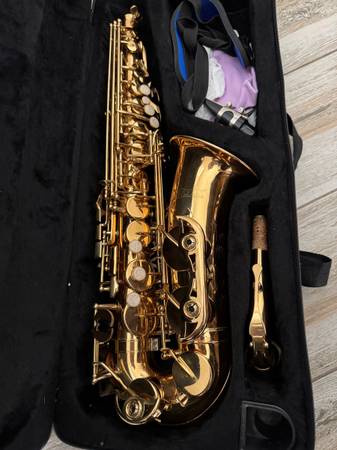 Lyx Jam saxophone with gold lacquer finish, beautifully designed faux mother of pearl key inlays. It comes with case, strap, and extra reed/mouthpiece. Great for middle school or high school band!