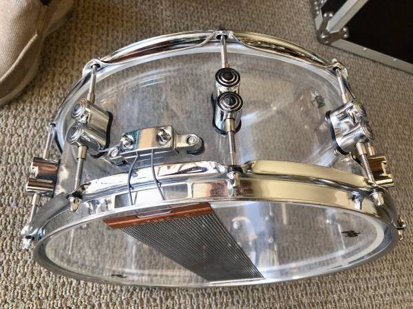 Perfect condition Acrylic snare drum. Chad Smith model 6 x 14. Seamless, 10 lug. DW Magnetic snare throw off. Sounds excellent. An amazing snare drum, and hard to find. No low Ballers, cash only.