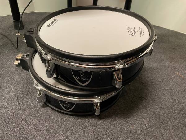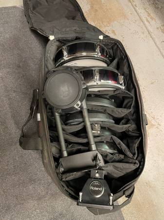 Roland TD-9KV electronic drum kit with two extra PD-125 trigger pads. Includes rack and module. Multi trigger/choke capable cymbal triggers. Cable snake with single point connection to module. This is an older kit but the KV designation was a later update. This is still a good sounding kit for live or studio use. I used PD-125 pads as snare and floor tom but one PD-125 is showing signs of dead spots; may need new trigger element. Includes soft Protection Racket carrying bag with customizable spacing. $500 cash only please; no trades. Please reply with number or email where I can reach you.