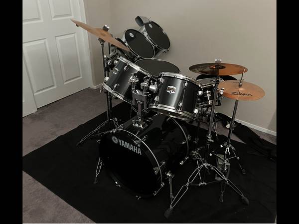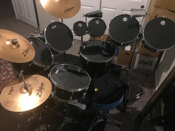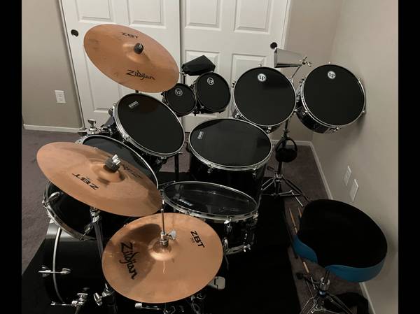 Selling Yamaha Gigmaker Drum set with two sets of Latin Percussion Timbales (will sell separately- extra heads included for bigger set), Black LP heads, drum set has Evans Hydraulic drum heads(extra heads, timbale sticks, drum sticks, even two cow bells(more cowbell) all Zildjian ZBT cymbals, stands shown, and drum throne. This set was formerly owned by the niece of Derrick Green, lead singer of Sepultura. Have invested over $1395 in the full set, selling for $950.
