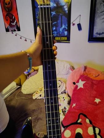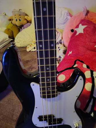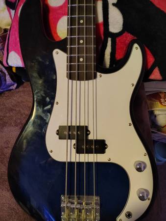 I'm trying to sell a electric bass guitar, it's in good condition it's black blue and white all the strings are good it plays good and the grand is glarry. Text me for more info