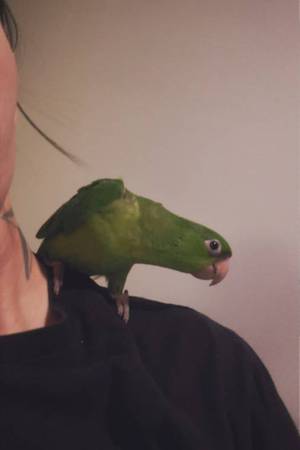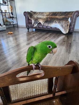 Pickles is a Mexican Green Conure needing his forever new home. I unfortunately am leaving Vegas for over a month and have not found a sitter. He has all his paperwork fron the breeders I got him from in CA, and his hatch date is in June 2025. He is very social and tame, loves people and loves friendly dogs. Comes with his cage and toys and whats left of his food.
