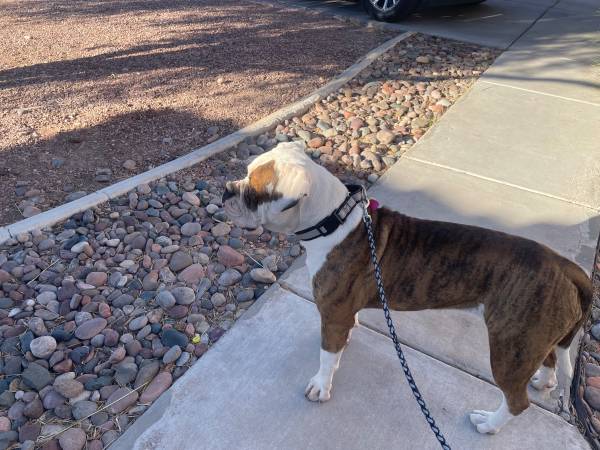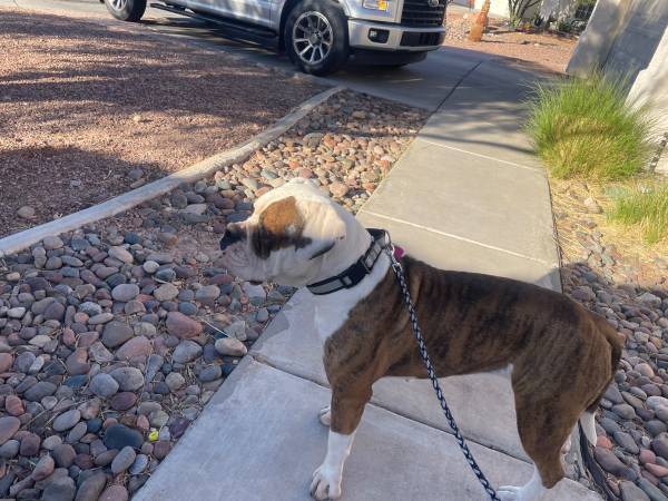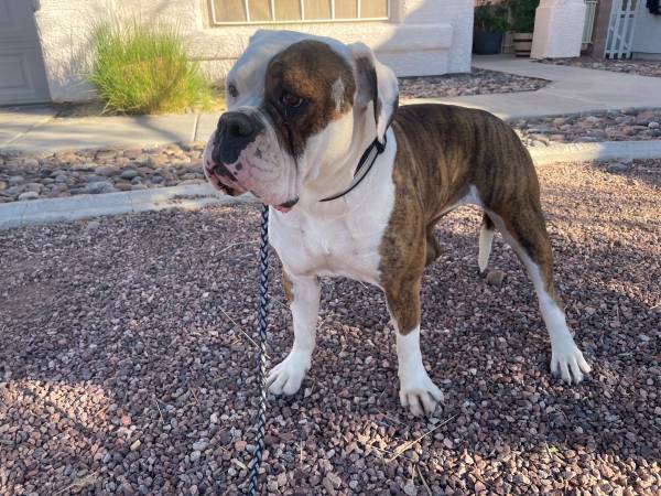 Our beautiful Olde English Bulldogge girl will be turning three on December 27, 2025. She is IOEBA registered and has such a loving, gentle nature. She gets along wonderfully with dogs of all ages and is especially sweet and patient with children.