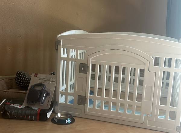 Dog gate with door 2 gates for doorways or stairs bowls beds toys leash brand new in package