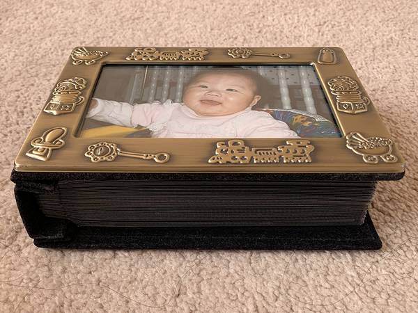 This is a babies photo album with brass photo frame front. It holds 100 4x6 photos. It is in like new condition.