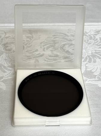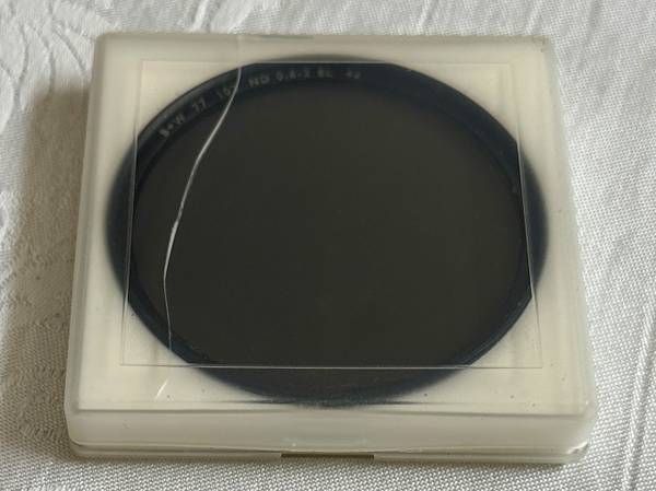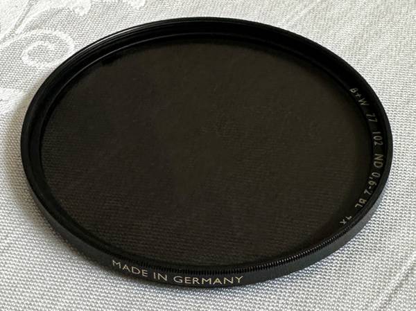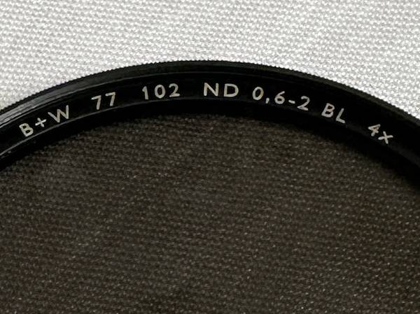 This is a B+W 77mm 0.6 ND 102 Slim Filter (4x reduction of light, or 2-stop neutral density filter). The slim frame ensures no vignetting when used on wide angle lenses. This is a high quality filter made in Germany. I have never used it, and it's been sitting in my camera bag for a long time. The filter is in new condition. The plastic case has a crack which doesn't affect the filter itself.