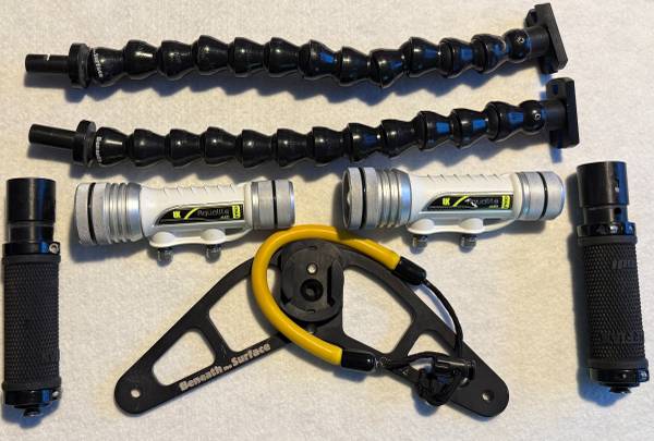 Hello, I have a whole bunch of stuff here for a GoPro. It's all I used for scuba diving for up close macro photography. The lights work, the tray is still sold from beneaththesurface1 dot com. The lights are Aqualite eLED Pro and the lenses are from Backscatter. It's a pretty cool set up if you need lights and a good way to mount them. I would prefer to sell it all together, that's why the price is low.