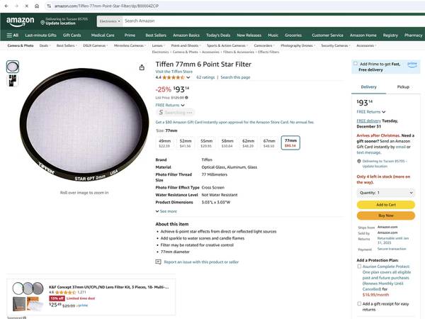 This is a new Tiffen 77mm 6pt/2mm Grid Star Effect Filter. It creates multiple points of light, or "stars," streaking outward from a central light source. This filter comes in a rotating mount for critical placement of the star effect. This filter was made in the USA. The current price on Amazon is $93.14 plus tax (see last photo/screenshot).
