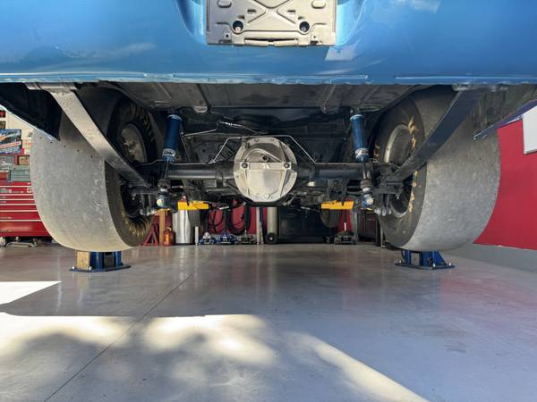 rear 12 bolt rearend , shortened 2" per side (56.5" wms to wms),car has DSE mini-tubs , with billet housing ends, no c-clips, Mark Willaims spool w/ 4.11 gears, ARP hardware, Mark Williams Masterline Pro-street 35 spline axles , reinforced leaf spring perches, 1350 billet yoke