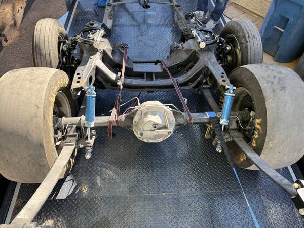 Calvert split mono leaf springs w/ Cal-Tracs bars setup,, stock leaf spring bucket/ mounts, rear DSE Billet offset leaf spring shackles , AFCO adjustable shocks, Strange 4 piston rear disc brakes ,stainless steel brake lines, Centerline Convo Pro rims w/ Hoosier Slicks