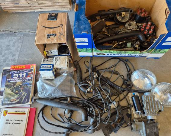 84-87 Porsche Carrera parts new and used packed in large box. Hard tp find parts, that would cost a lot if you could find and ship them individually. Take the whole lot of parts in the box.